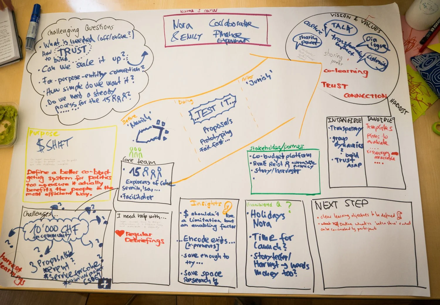 The Art of Hosting community created a canvas (“harvesting template”) which outlines several prescriptions which form the building blocks for the planning activities. Everything that emerges during the group conversations is written down into the assigned blocks.
